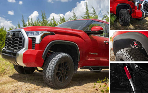 The Tundra TRD Lift Kit offers a 3” lift in the front and a 2” lift in the back, providing 2.6” of additional ground clearance overall. It also has increased suspension stroke to support, lift and aid in off-road performance and on-road stability.